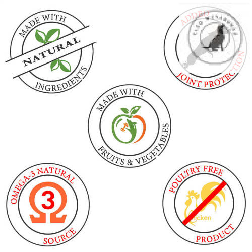 Hús és állati eredetű alapanyagok (húsliszt: bárány 24%, hal 5%), marhafaggyú 8%, kukorica, búza, korpa, rizs, alma, sárgarépa, glükózamin-kondroitin, F.O.S. (frukto-oligoszacharid), Yucca schidigera kivonat